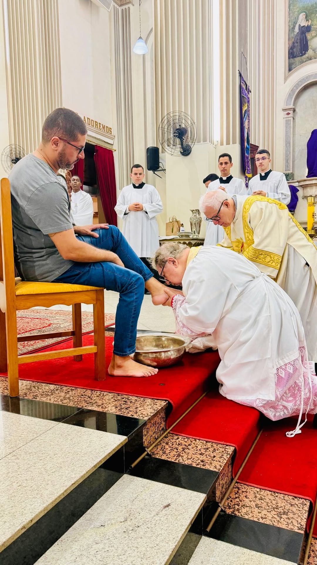 Na noite desta quinta-feira (03/04), o Bispo Diocesano de Campos, Dom Roberto Francisco, presidiu a Santa Missa da Ceia do Senhor, também conhecida como celebração do Lava-pés, na Catedral Basílica Menor do Santíssimo Salvador, no Centro de Campos. A Missa foi concelebrada pelo vigário-geral Monsenhor Leandro Diniz, pelo reitor do Seminário Pe. Fábio de Melo, além de demais sacerdotes, com a presença de vários diáconos, religiosos e seminaristas. A Quinta-feira Santa inaugura o Tríduo Pascal com a Missa da Ceia do Senhor, celebrando a instituição da Eucaristia e do Sacerdócio. O rito do Lava-pés, realizado nesta missa, simboliza a humildade, o serviço e o amor ao próximo, com Jesus lavando os pés dos discípulos como exemplo de doação. Nesta liturgia a Igreja celebra a instituição da Eucaristia e do sacerdócio, além de enfatizar o mandamento do amor e o serviço ao próximo, simbolizado pelo gesto do lava-pés.