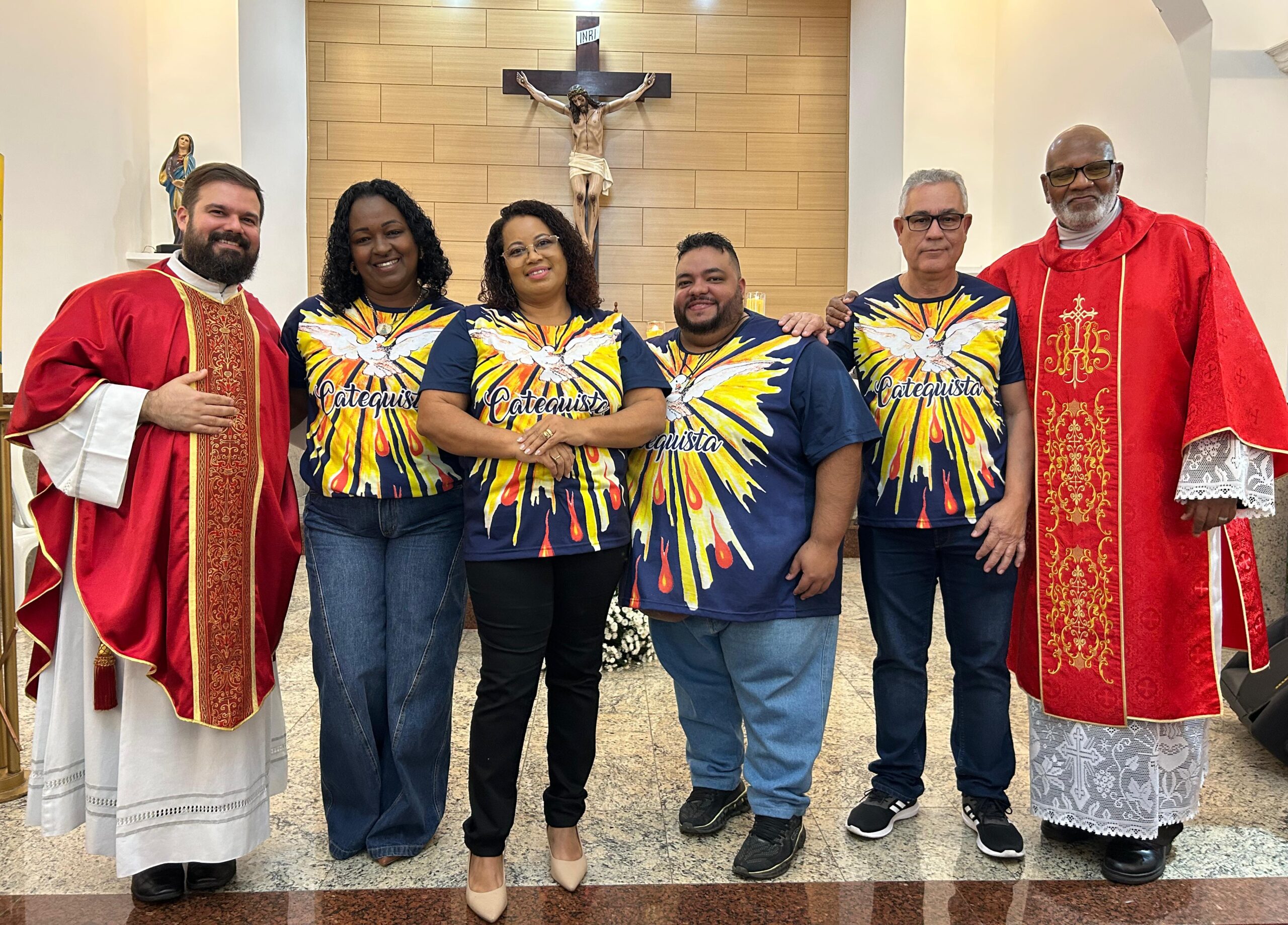 Com os olhos em lágrimas, o casal Ivanete Barreto Nascimento de Jesus e Carlos Henrique de Jesus Nascimento, após receberam o crisma, não conteram a emoção e partilharam sua história. “Estamos juntos há 18 anos. Eu não era católica praticante e o meu esposo frequentava outra denominação religiosa. Com o tempo decidimos seguir na mesma fé. Desde 2023 estamos juntos na caminhada e com isso, sentia um desejo muito grande de fazer parte da comunhão. A partir daí, nos preparamos para casarmos pela igreja e hoje recebermos dois sacramentos: a 1ª Comunhão e o Crisma. Estou muito emocionada”, detalhou Ivanete.
