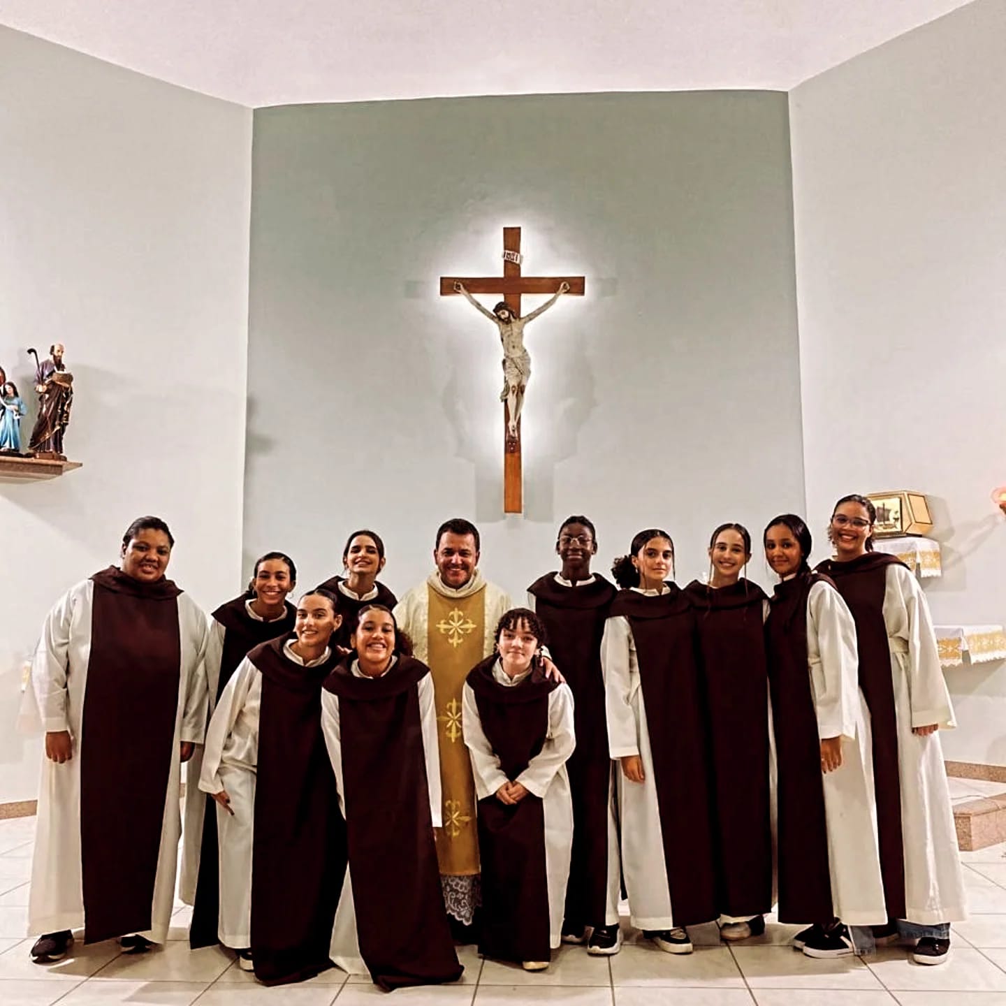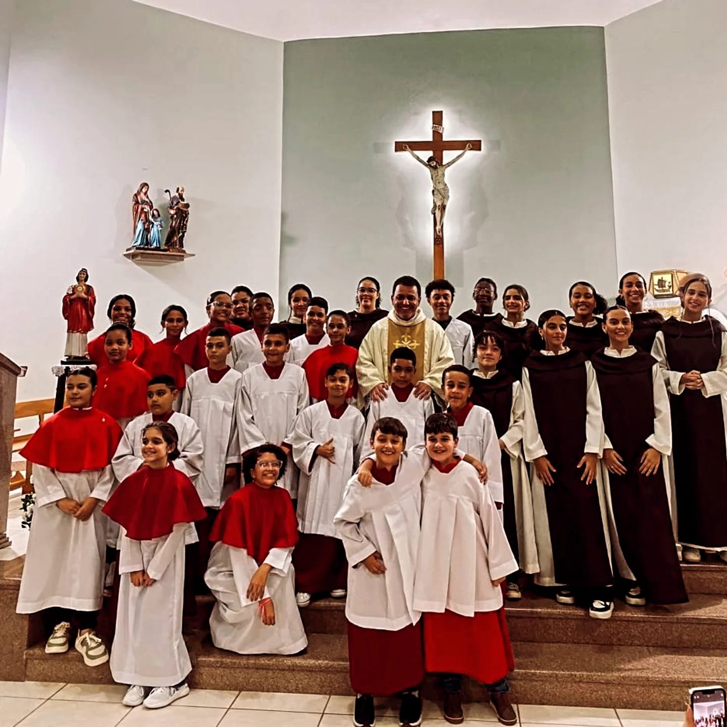 Os fiéis da Quase-paróquia Sant´Ana e São Joaquim, no distrito de Retiro do Muriaé, em Itaperuna, participaram neste domingo (18/05), da Santa Missa de investidura dos novos coroinhas, cerimoniários e servas do altar. A celebração foi realizada na Igreja Matriz e foi presidida pelo administrador paroquial Pe. João Paulo de Souza. Coroinhas, cerimoniários e servos do altar são todos parte essencial da liturgia, desempenhando papéis importantes na celebração da missa e na formação espiritual de jovens e crianças. Servos do altar são um grupo mais amplo que inclui todos aqueles que prestam serviço ao altar. São jovens, geralmente entre 15 e 25 anos, que podem ter funções mais complexas, como organizar a entrada dos celebrantes, ou coordenar a movimentação dos coroinhas e outros servos do altar.
