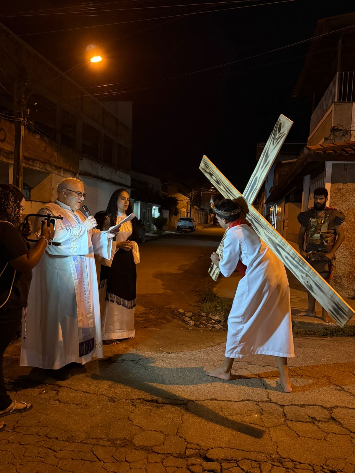 A Paróquia Nossa Senhora de Lourdes, no município de Itaperuna, promoveu na noite desta quarta-feira (31/03), a Via-Sacra encenada, pelas ruas próximas a Igreja Matriz, no bairro Cehab. A cada estação, os fiéis foram convidados a caminhar espiritualmente ao lado de Jesus, onde puderam recordar seu amor, sofrimento e entrega pela humanidade. A encenação foi conduzida pelos grupos Geração Luz e JUPE. O pároco Pe. Crimátio Verdan, acompanhou de perto a encenação e ressaltou a importância da participação dos jovens da comunidade. “A encenação tocou os corações e tornou ainda mais viva a mensagem de esperança, perdão e misericórdia. Em meio às ruas do nosso cotidiano, a presença de Deus se fez sentir de maneira especial, lembrando-nos que a cruz também faz parte do nosso caminho, mas que ela sempre conduz à ressurreição. Que essa experiência fortaleça nossa fé e nos inspire a viver, no dia a dia, os ensinamentos de amor e solidariedade deixados por Cristo”, declarou o sacerdote.