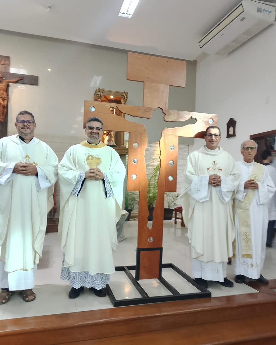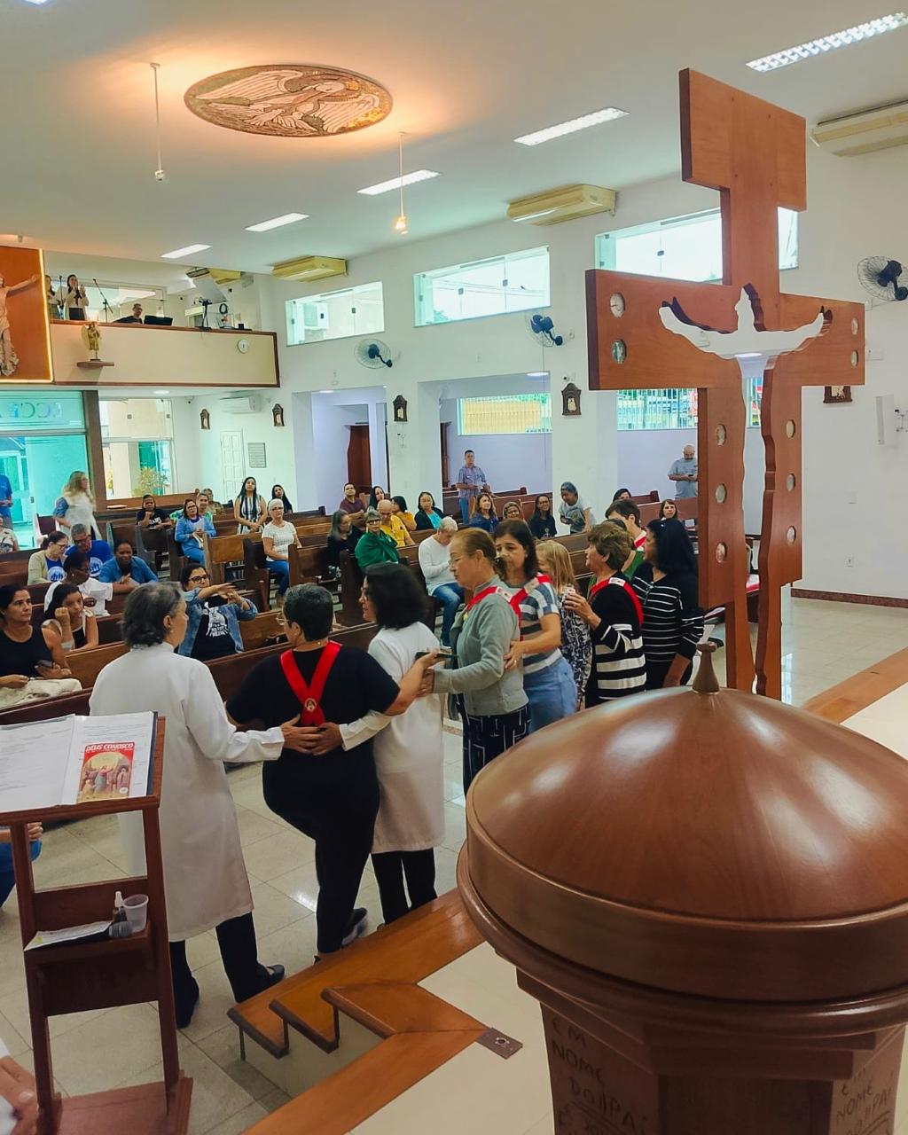 A Paróquia São João Batista, no bairro do Capão, em Campos dos Goytacazes, recebeu na manhã desta quarta-feira (07/05), a Cruz Peregrina do Ano Jubilar, que foi levada por uma comitiva da Paróquia Nossa Senhora de Fátima, no bairro IPS. A acolhida aconteceu com a celebração da Santa Missa, às 7h, presidida pelo pároco Pe. Alexandre Mothé, concelebrada pelos padres Pe. Antônio Marcelo e Pe. Fábio de Melo, contou com a presença do diácono Paulo. Em clima de alegria e oração, os fiéis participaram com entusiasmo deste momento especial que marca o percurso da Cruz pelas paróquias da Diocese, em preparação ao Jubileu. “Tivemos um momento de acolhida da Cruz. O Pe. Antônio Marcello organizou um momento de peregrinação, onde a cruz passou por nossa Paróquia, também esteve no Carmelo São José e no Santuário de Nossa Senhora do Perpétuo Socorro. Cantamos o jubileu, rezamos a oração, fizemos uma reflexão, essa catequese sobre a cruz peregrina e o jubileu no começo, na chegada, e depois a missa”, declarou o Pe. Alexandre.